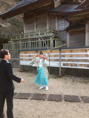 前日から宿主が祈願する的射神事の的、弓、鯨の煮ナマス、鯨汁、三升の餅米などを用意し、神事当日地区民へ振る舞われます。その間、次年度の当番と当年の宿主は直径60cmもある大餅とともに神社へ赴き、病害虫駆除のため烏が描かれた的を神職立会いのもと弓矢で射抜きます。
